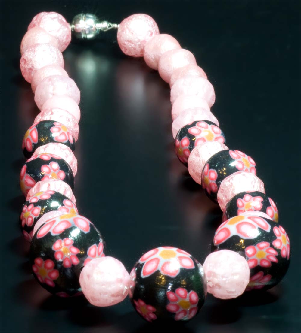 Hier seht ihr eines meiner neuen Werke - eine Kette aus handgefertigten Fimo-Perlen im Keramik-Style mit Metall-Spacern und Kristallperlchen.